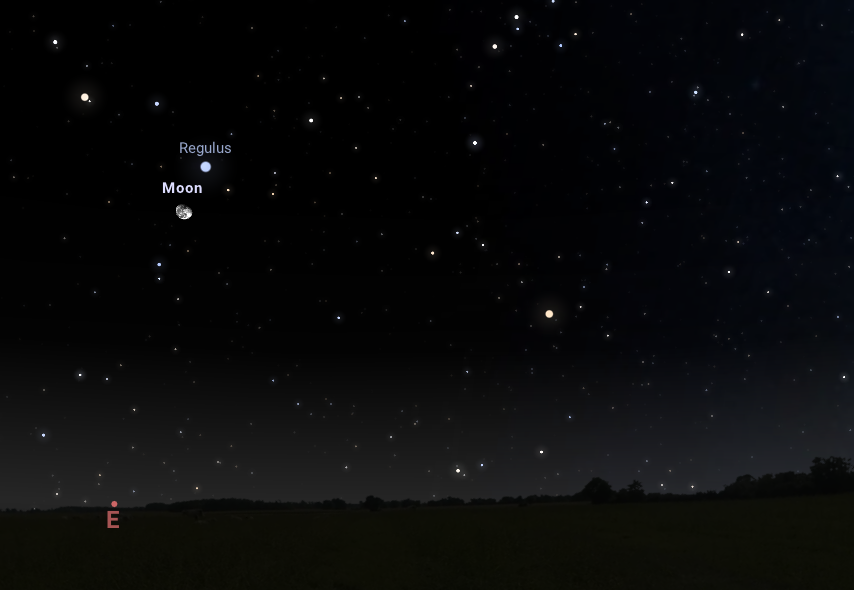 A Regulus és a Hold együttállása: este 22:00-kor a Hold 2,6 fokos távolságba ér a Regulustól 18 fokos látóhatár feletti magasságban.