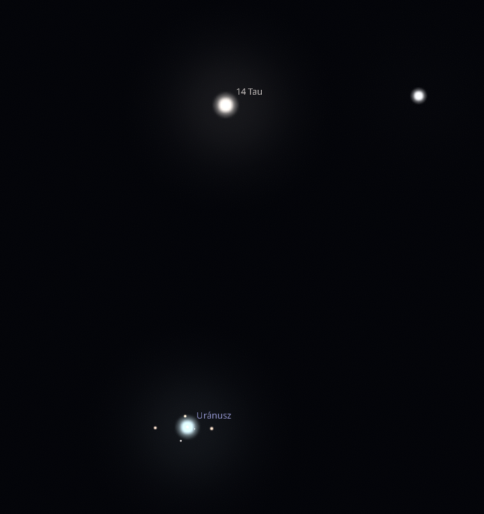 Luca napján, december 13-án az Uránuszé lesz a főszerep. A bolygó mindössze 6,8 ívpercre megközelíti a 14 Tauri jelű, 6,1 magnitúdós csillagot este 21:14-kor. A Bika csillagkép gazdag halvány, szabad szemmel alig látható csillagokban, amelyek között az Uránusz általában nehezen ismerhető fel, mivel szinte teljesen azonos a fényessége. Most a 14 Tau lesz a referenciapont: 6,1 magnitúdós fényességével éppen a szabad szemes láthatóság határán mozog sötét égen, így a távcsöves megfigyelés során az egyik legkönnyebben felismerhető csillag lesz a környéken a közelben levő 13 Tau-val egyetemben. Ennek köszönhetően az együttállás jól követhető lesz kisebb teleszkópokkal és binokulárokkal is. Az Uránusz jellegzetes türkizkék színe pedig szép kontrasztot alkot a 14 Tau fehéres-sárgás fényével.
