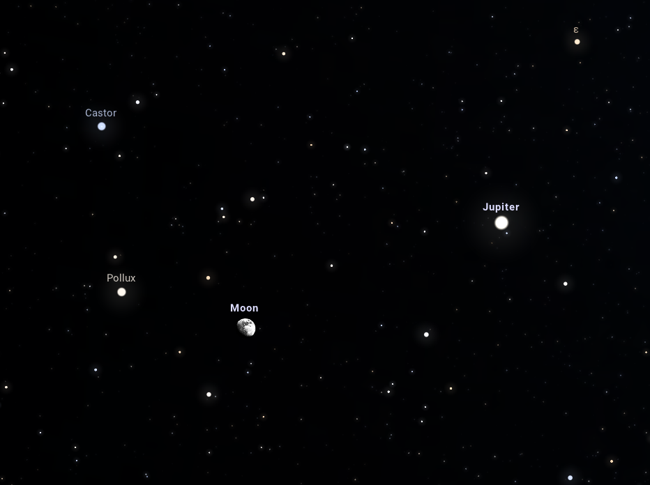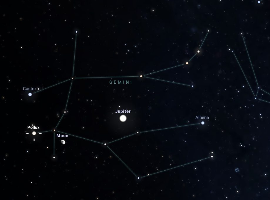 Bár a Hold és a Jupiter nézegetése önmagában is szívmelengető látvány, ezen az estén egy négyszög tagjai között figyelhetjük meg őket a Castor és a Pollux társaságában. A Castor 1,6 magnitúdós látszó fényességével kékes színnel világít az égen, az annál kicsit fényesebb, 1,1 magnitúdós Castor pedig sárgás árnyalatú. Ez a két csillag a Nagy Téli Hatszög néven ismert aszterizmus részét képezi, amelyben megfigyelhetjük még az Orion csillagkép Rigel, a Bika csillagkép Aldebaran, a Szekeres csillagkép Capella, a Kis Kutya csillagkép Procyon, valamint a Nagy Kutya csillagkép Sirius nevű csillagát. A felsorolt objektumok mind igazán fényesek, és éppen ezért egy derült téli estén, avagy éjszakán jól megfigyelhetőek.