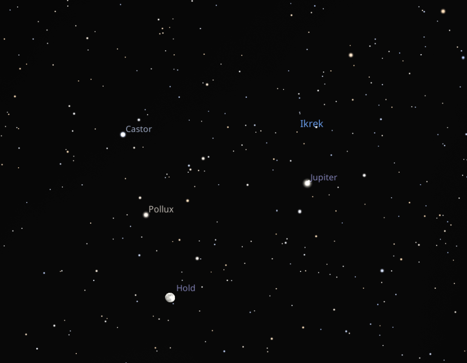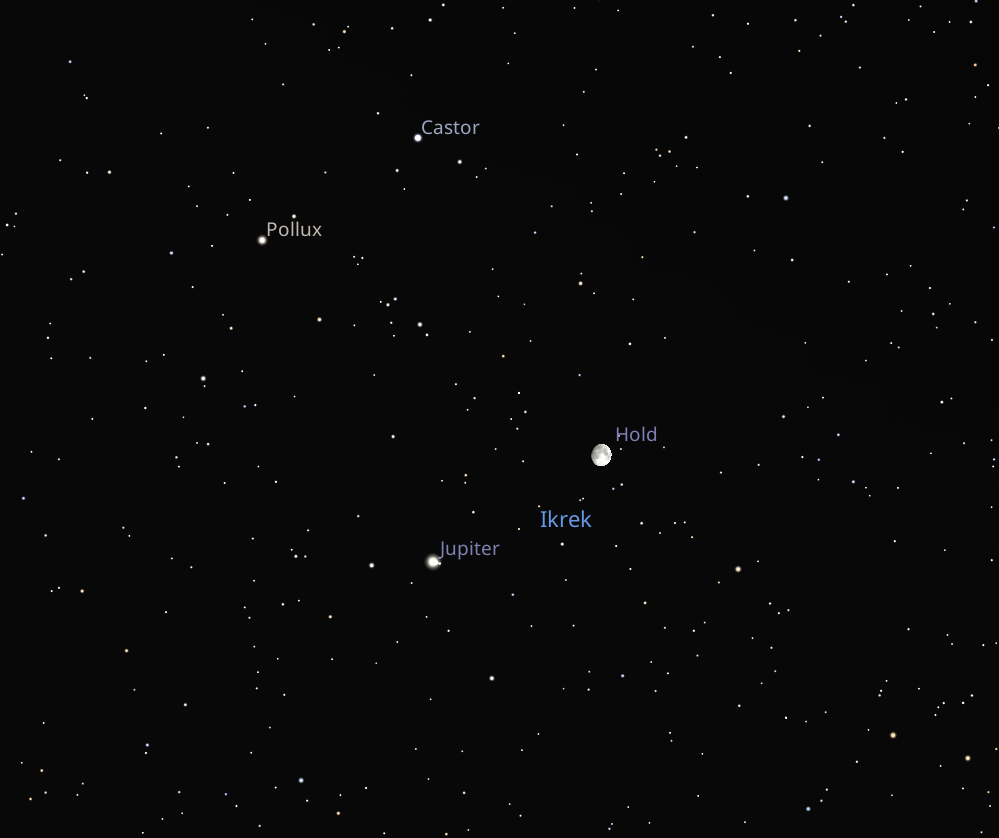 s közelükben látszik a Jupiter bolygó is. Pénteken este 23:15-kor magasan pompázik majd égi kísérőnk minden mással összekeverhetetlen alakja, s a közelében lévő legfényesebb fényforrás a Jupiter lesz, amelyeket a szabad szemmel szintén jól látható Pollux és a Castor követ. A négy felsorolt égitest egy téglalap négy csúcsát alkotja majd, amelynek megfigyelése nem igényel tehát sem csillagászati eszközöket, sem észlelési tapasztalatot. Ugyanez igaz a következő napi együttállásra, amelynek résztvevői ugyanezek az égitestek. Szombaton 18:17-kor a Hold, a Pollux és a Castor pontosan egy vonalba ér, s az egyenesből T-betűt csinál a Jupiter közeli fénypontja. Mindkét este érdemes kinézni tehát az égre, s a Hold szemrevételezése után megkeresni a közelében lévő legfényesebb csillagokat, illetve a bolygót.