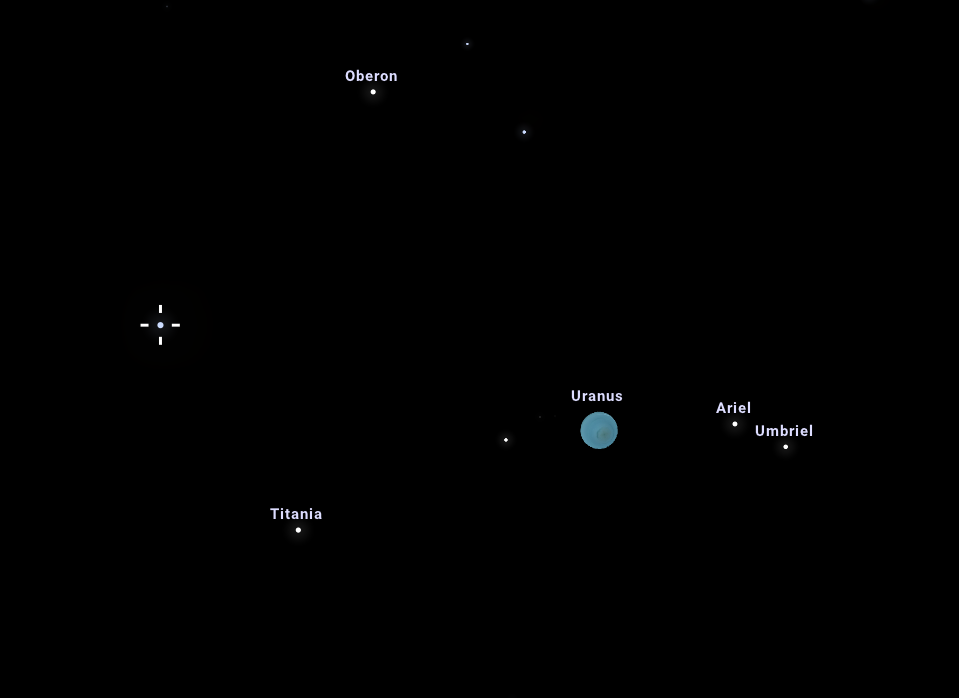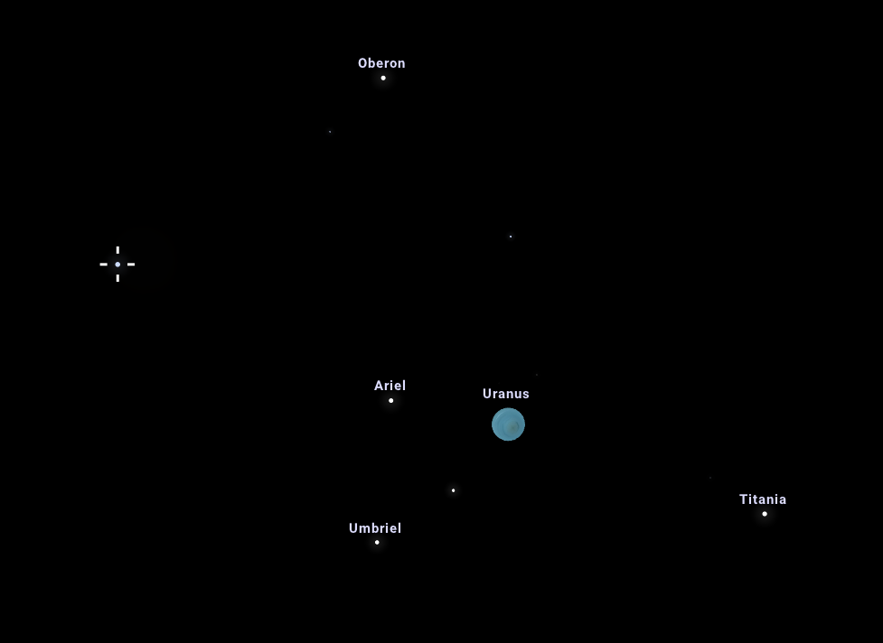 Ezen a szerdai napon este 22:00-kor szintén érdemes nagy távcsövünket az ég felé fordítani, ugyanis a hónap főszereplője, az Uránusz közelébe kerül egy 12,4 magnitúdós látszó fényességű csillag, a Gaia DR3 57076679390011136, mégpedig olyan módon, hogy szinte összekeverhetjük a bolygó egyik holdjával. A csillag az Uránusz délkeleti, bal oldali peremétől 36"-re látszik majd, a Titania nevű, 13,9 magnitúdós Uránusz-holdtól pedig mindössze 16"-re. A bolygó az együttállás pillanatában 20 fokos magasságban jár a nyugati horizont felett.