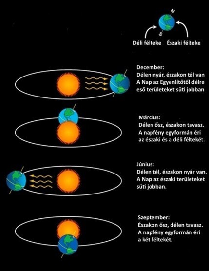 Egy év alatt teszi meg teljes keringését, miközben a Nap látszólag végighalad az égen az ekliptika vonalán, vagyis azon a nagy körön, amely a Föld pályasíkjának és az éggömbnek a metszése. Ez a mozgás alapvetően meghatározza a napszakok hosszát és az évszakok váltakozását. Bár gyakran gondolnánk, hogy az évszakok oka a Föld Naphoz mért távolságában keresendő, valójában nem ez a döntő tényező. A Föld január elején, a perihéliumban halad el a Naphoz legközelebb, júliusban pedig az aphéliumban van, vagyis a legtávolabb tőle – mégis ekkor van a legnagyobb hőség az északi féltekén. A valódi ok a Föld 23,5°-os tengelyferdesége, amely meghatározza, milyen szögben éri a napsugár a bolygó különböző területeit az év folyamán. A dőlés miatt az északi és déli féltekén egymással ellentétes módon változik a nappalok hossza valamint az évszakok változása, így alakul ki a tél, tavasz, nyár és ősz periodikusága.