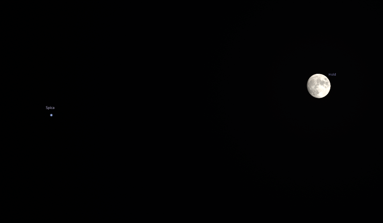 Információk a jelenségről: A Spica a Szűz csillagkép alfa jelű csillaga, egy forró, kékesfehér fényű kettőscsillag-rendszer, amely körülbelül 250 fényévre található a Földtől. Fényessége miatt a tavaszi égbolt egyik könnyen azonosítható csillaga, különösen amikor a Hold „odavezeti” a tekintetünket. A Hold ebben az időszakban közel telihold fázisban van (97%-os megvilágítottság), így szinte teljes korongja ragyog. Ilyenkor a felszíni részletek kevésbé látványosak a rövid árnyékok miatt, viszont a fényessége maximális, ami erősen befolyásolja az égbolt kontrasztját.