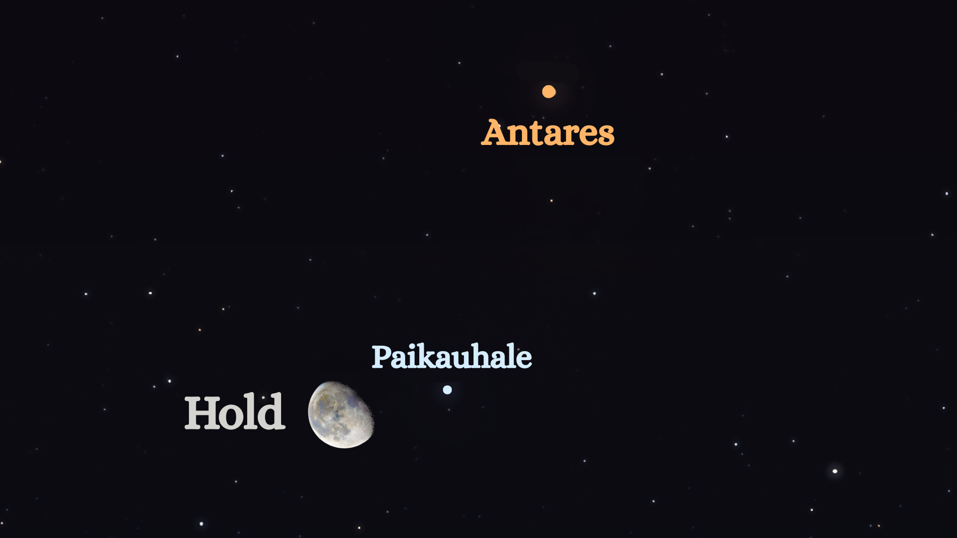 A csillag a Holdtól jobbra fölfelé lesz látható, attól 2,6°-ra. Színe vöröses-narancssárga, fényessége pedig 0,9 magnitúdó. A Hold peremétől jobbra, attól 34’-re lesz a Paikauhale, azaz a tau Scorpii, egy kék színű csillag, amelynek látszó fényessége 2,8 magnitúdó.