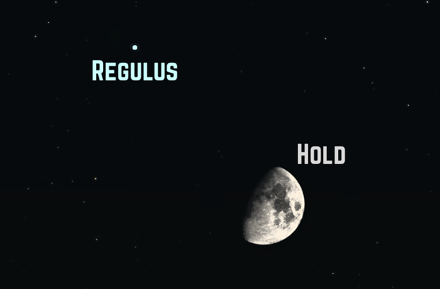 Megfigyelése: Holdunk és a Regulus közelsége egyszerűen megfigyelhető akár szabad szemmel is. A jelenség éjszakáján égi kísérőnk felénk néző oldalának 68%-a lesz megvilágítva, így fénye nem mossa majd teljesen el a csillagét. A párost 22:00-kor a délnyugati égbolton vehetjük szemügyre, 50° magasan. A legközelebb 2:25-kor kerülnek egymáshoz. Ekkor már csak 10°-ra lesz a Hold a nyugati látóhatár fölött.