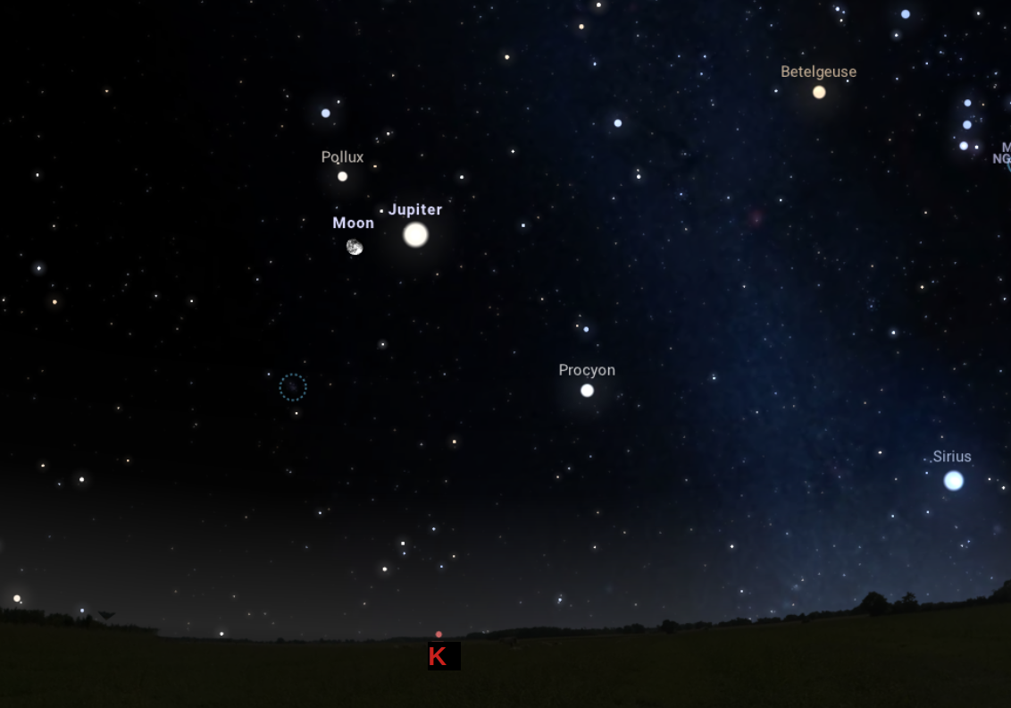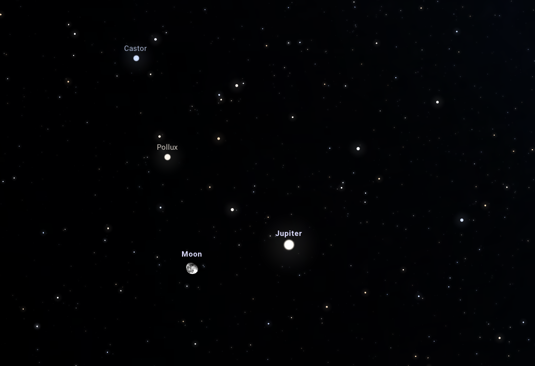 Este pontosan 21:39-kor ugyanis az Ikrek csillagképben járó Hold a Pollux és a Castor csillagok alá ér, s egyenesüket L-betűhöz hasonló, derékszögű alakzatra egészíti ki a Jupiter. Mivel az égitestek egyesével is jól láthatóak, és fényesek szabad szemmel nézve, együttesüket könnyedén észreveheti az is, akinek nincs sok észlelési tapasztalata. Mindenkit biztatunk az észlelésre akár a szabad ég alól, akár egy keleti irányba néző ablakból.