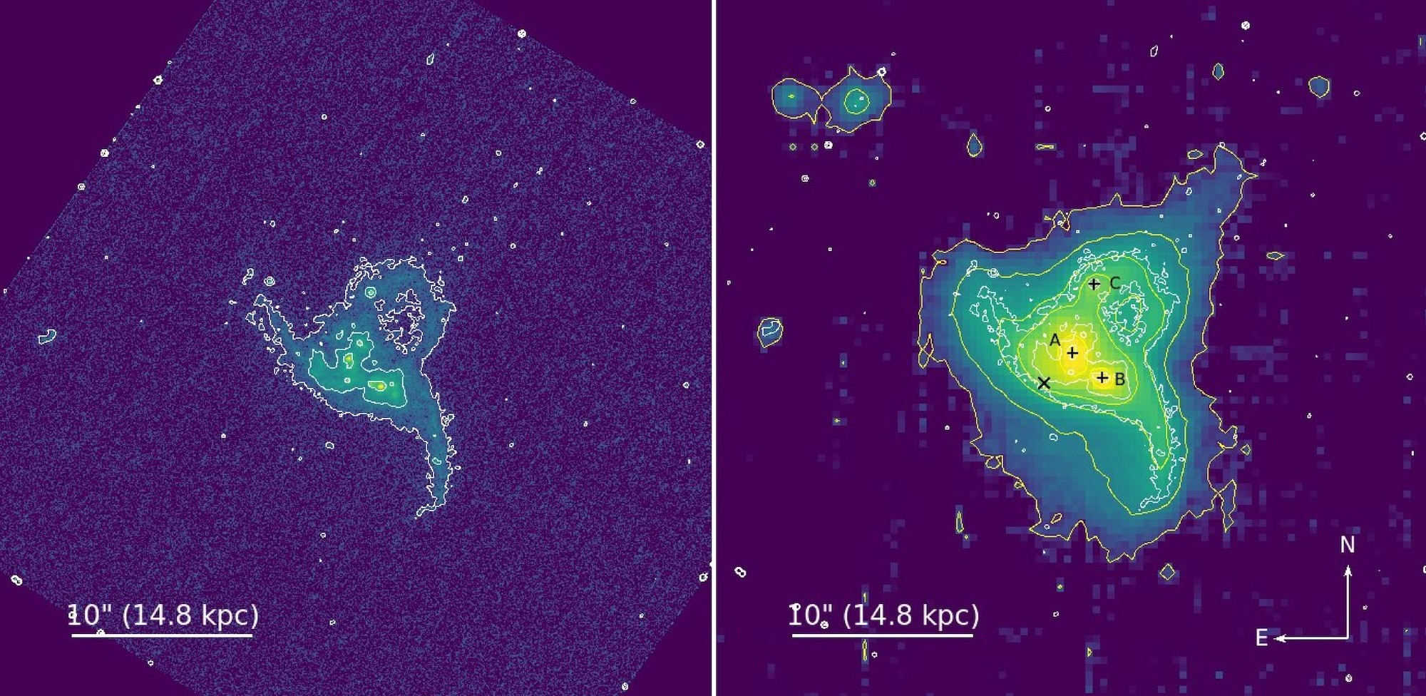 Kettős aktív galaxismagokat ritkán találunk, az azonban még kevésbé gyakori, hogy három AGN alkosson egy csoportot. Az SDSS J0849+1114 egyike az ilyen kivételeknek: magjában 3 aktív (éppen tömegbefogó) fekete lyuk kering. A különleges feketelyuk-hármas vizsgálata betekintést nyújthat abba, hogy hogyan hatnak kölcsön egymással a fekete lyukak és ez milyen hatással van a környezetükre. A csillagászok ezt vizsgálták a nemrégiben, és érdekes megállapításokra jutottak az összeolvadást illetően.
