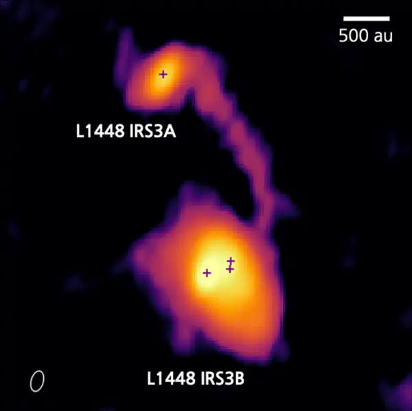 Egy kutatócsoport Youngwoo Choi (Szöuli Nemzeti Egyetem) vezetésével talált egy ilyen hidat két fiatal csillag, az L1448 IRS3A és az L1448 IRS3B között. A tőlünk nagyjából 1000 fényévre lévő protocsillagok még mindig gyűjtik a gázt és a port a Perseus csillagkeletkezési felhőből, amelyben születtek. Jelenleg 2100 csillagászati egységre lehetnek egymástól, vagyis körülbelül 2100-szor akkora távolságra, mint a Föld a Naptól. Ez kevesebb mint a százada a Nap és legközelebbi szomszédja, a Proxima Centauri közötti távolságnak.
