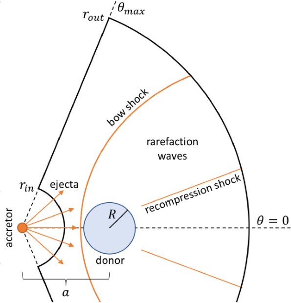 A 2. ábra diagramján egy íjhoz hasonló alakú hullámfrontot (bow shock) láthatunk, amelyet a felrobbanó csillag által keltett lökéshullám hozott létre, és a társcsillag környezetében íjként hajlott meg. Ez a gyorsan mozgó anyag a társcsillaggal találkozva jellegzetes alakot vesz fel, ezzel nyomot hagyva a környezetén és a fényességváltozás ütemén is. A szimulációk futtatásával az ezáltal létrehozott alakzatot lehetséges közvetlenül a robbanás utáni időpontokban is vizsgálni.